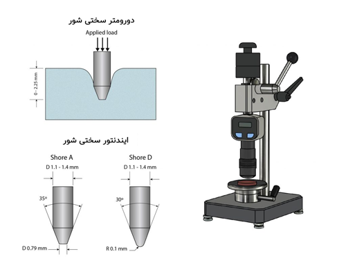 در روش شُر A سوزن به صورت مخروط نوک تیز بوده و در روش Shore D سوزن مخروطی با نوک کروی شکل است.
